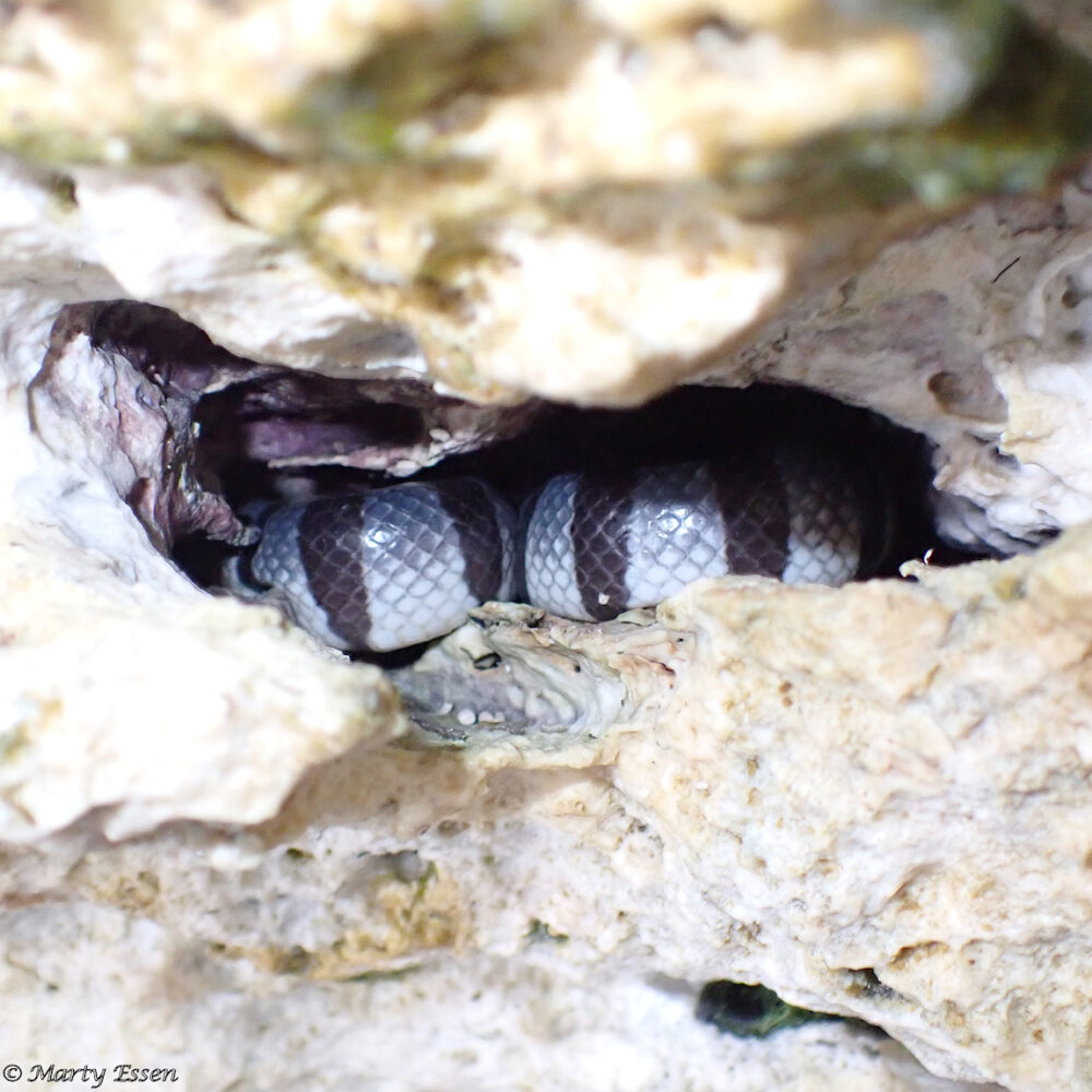 While in the Raja Ampat of Indonesian New Guinea, I often explored crevices in the volcanic rock formations along the ocean shore. My usual finds were colorful crabs and lizards, but I also found this sea krait (a venomous snake with a paddle-shaped tail). Sea kraits must leave the water to digest their meals, so that’s likely what this one was doing.