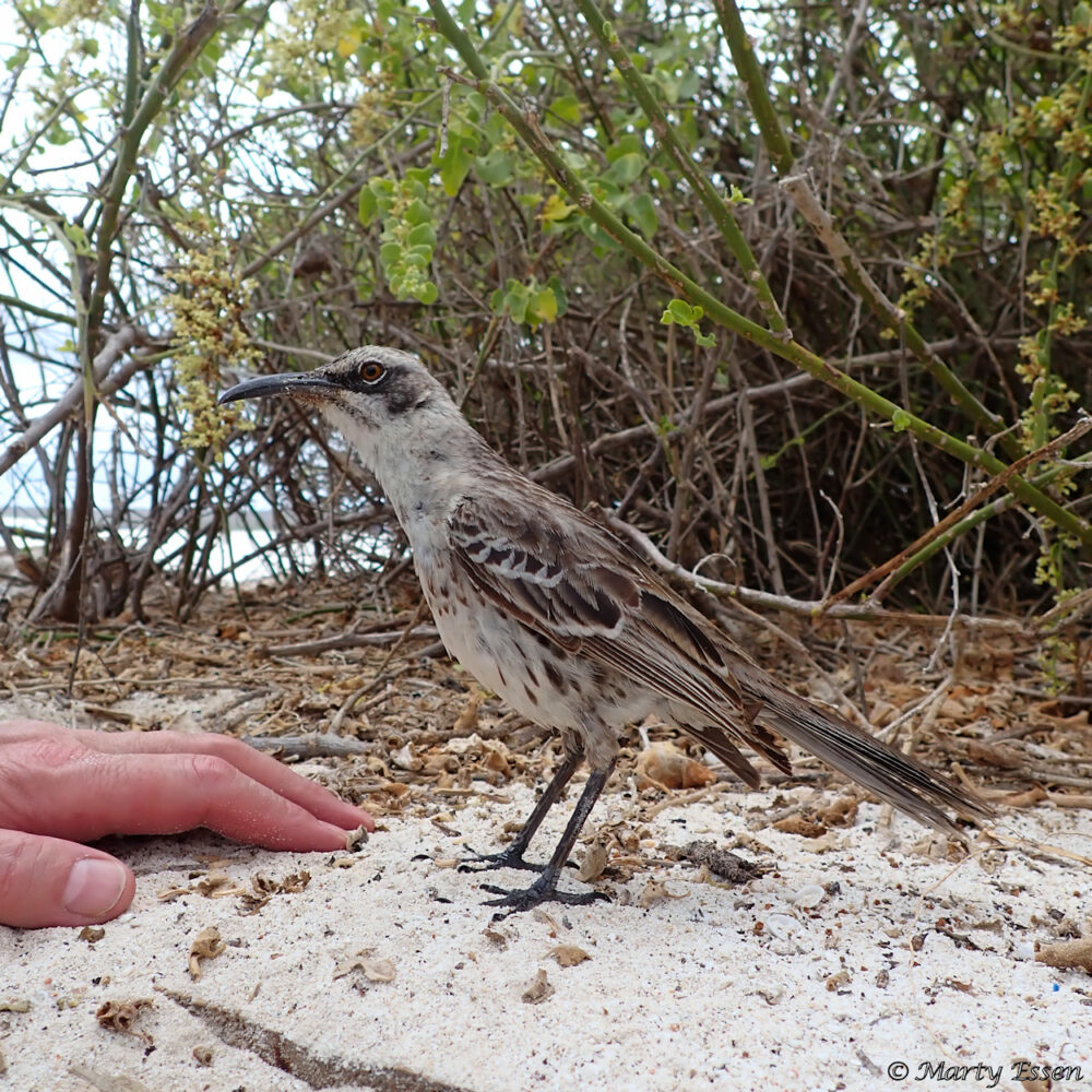 After posting a different Hood mockingbird image as today’s photo of the day, I came across this shot, which I like even more. These mockingbirds are found only on Española Island (previously called Hood Island). They live in social groups where the lower-ranking members help raise the young of the dominant pair. That’s my hand in the photo, and I’m using my other hand to aim my camera from the side. Obviously, these birds have no fear of humans.